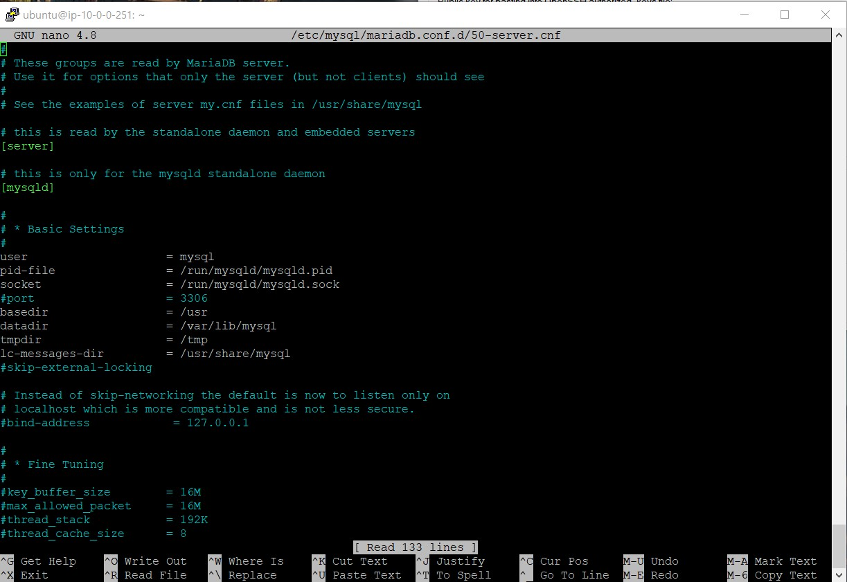 🔷기본적으로 MariaDB는 외부에서 접속이 불가능하도록 설정되어있음. 그래서 gedit이나 nano 명령으로 /etcmysql/mairadb.conf.d/50-server.cnf 파일을 열어서 bind-address =127.0.0.1 부분 주석 처리 후 저장하고 닫음