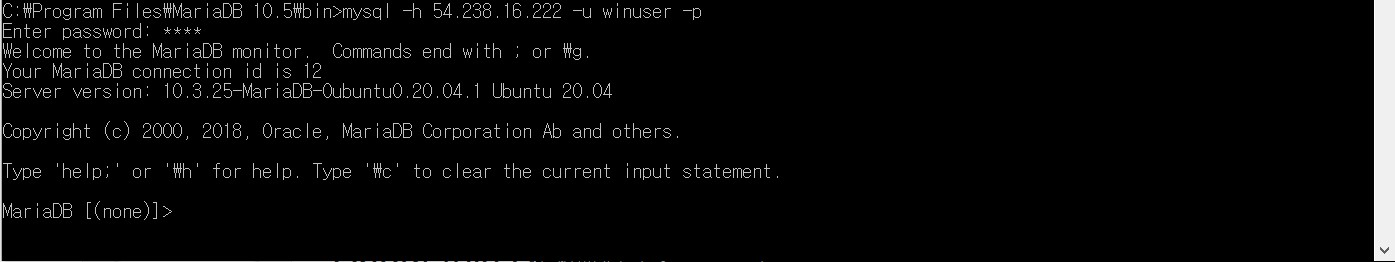 🔷다시 명령 프롬프트로 돌아가서 mysql -h 내서버IP주소 -u winuser -p 명령을 입력하여 winuser로 접속. 비밀번호는 4321