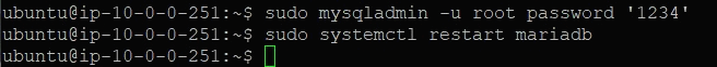 🔷sudo mysqladmin -u root password '1234' 명령으로 데이터베이스 관리자인 root의 비밀번호를 1234로 변경