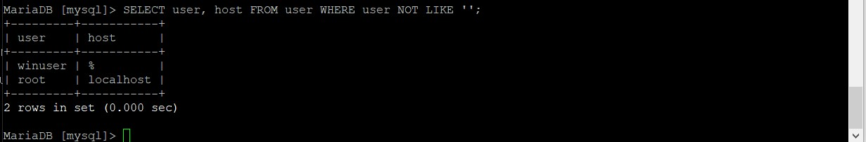 | USE mysql; SELECT user, host FROM user WHERE user NOT LIKE ''; |