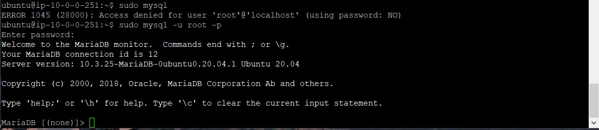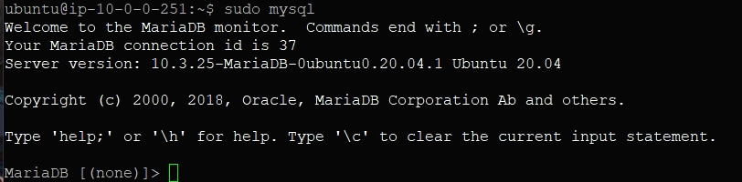 🔷mysql 명령으로 MariaDB 클라이언트 서버로 접속 (나는 sudo mysql 명령을 입력. 권한이 없기때문에 이후의 명령어 입력에서도 sudo을 이용하여 root권한을 빌려서 실행)