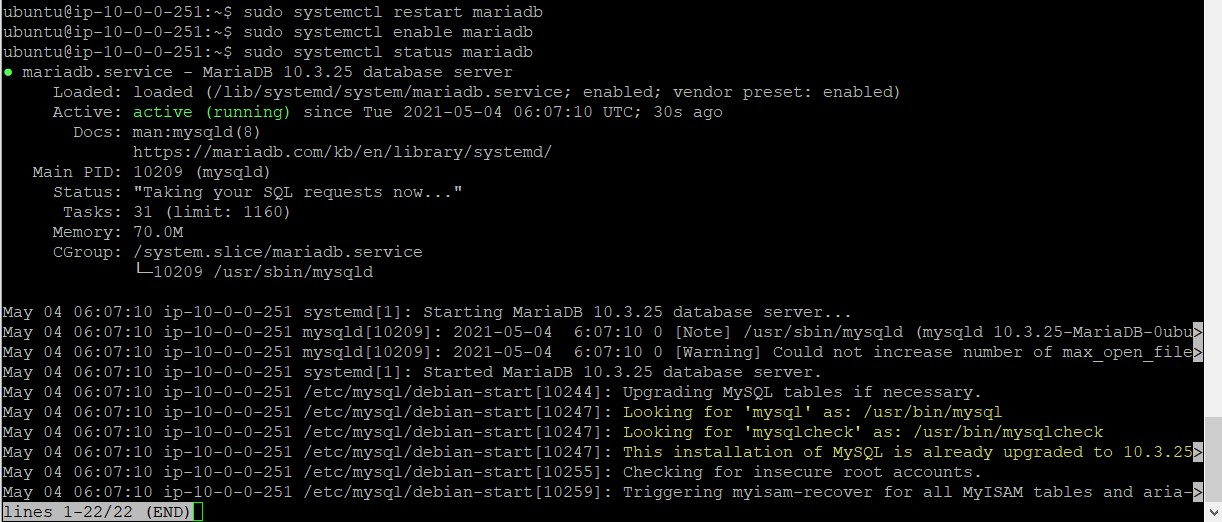 🔷sudo systemctl restart mariadb 명령으로 서비스 재시작