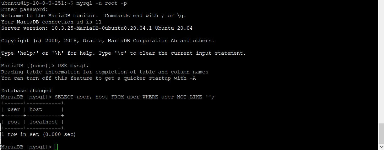 🔹여기까지 했을 때 지금은 비밀번호 입력도 없이 mysql 명령어만 입력하면 바로 서버에 접속할 수 있기 때문에 데이터베이스 보안 문제가 발생할 수 있음. 이 문제를 위해 보안에 중요한 데이터베이스 관리자인 root의 비밀번호를 설정