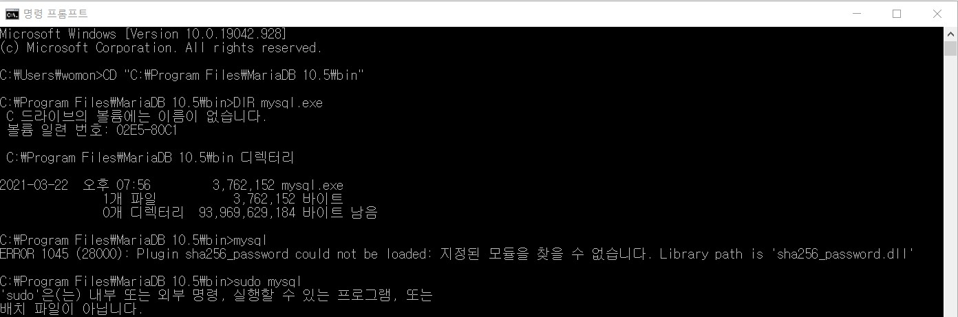 🔷MariaDB 클라이언트가 설치된 폴더로 이동시켜서 mysql 명령을 입력 ➠ 접속 실패(이유: 지금 내 컴퓨터에서는 MariaDB 클라이언트만 설치했을 뿐, MariaDB 서버는 설치하지 않았기 때문에 접속할 서버가 없어서 실행을 실패)