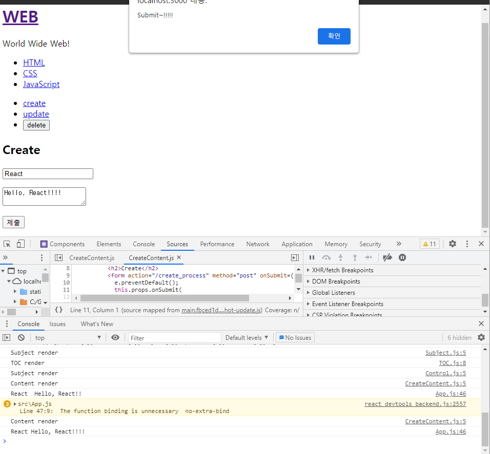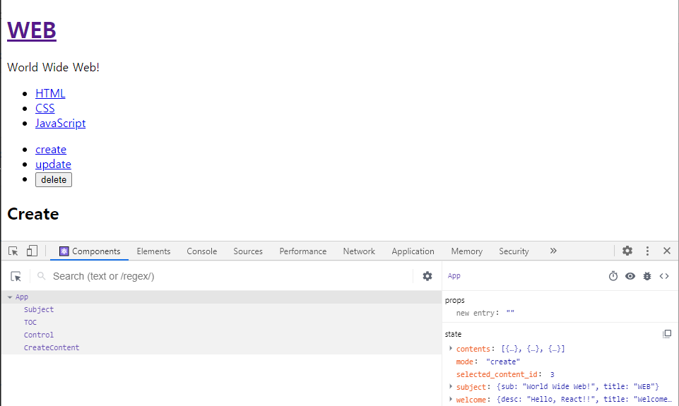 💡그 다음은 App 컴포넌트에 contents 맨 끝(HTML, CSS, JavaScript 그 뒤에)에 사용자가 create에서 입력한 값을 추가해야 함. 그러면 글 목록에 자동으로 추가되어야 함