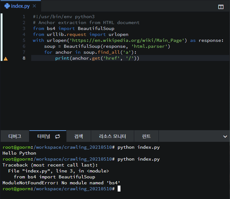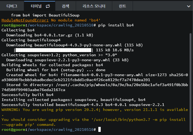 - 해결법: Beautiful Soup4 설치/ 터미널 창에 'pip(패키지 관리자) install bs4'라고 치면 자동으로 설치 가능