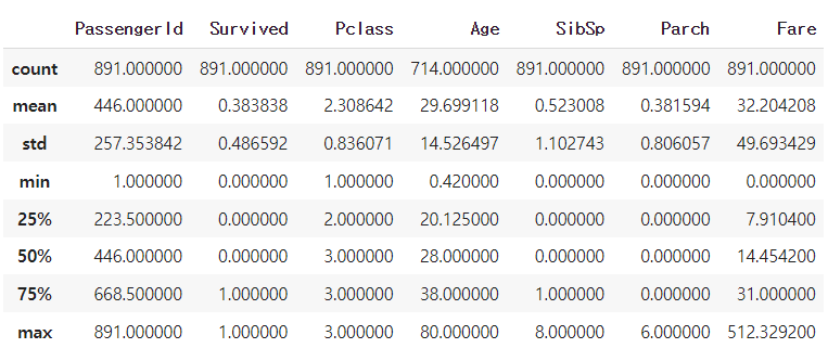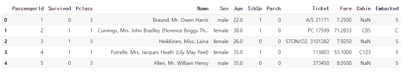 - 훈련용 데이터에는 Age, Cabin, Embarked에 NaN값이 있는 것을 확인할 수 있다.