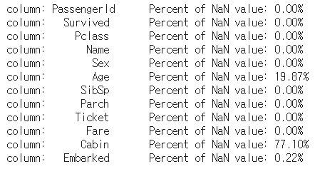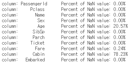 msg = 'column: {:>10}\t Percent of NaN value: {:.2f}%'.format(col, 100 * (df_train[col].isnull().sum() / df_train[col].shape[0]))