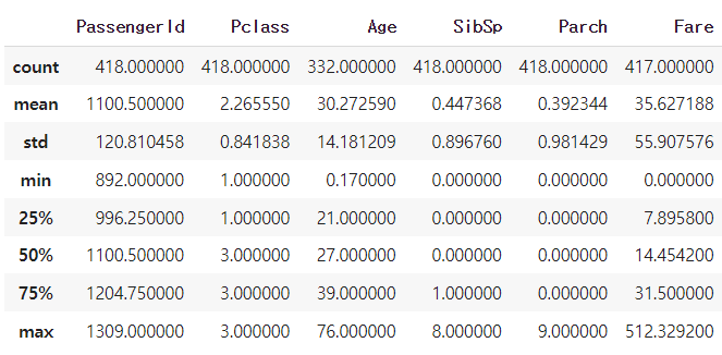 - 테스트용 데이터에는 Age, Fare, Cabin에 NaN값이 있는 것을 확인할 수 있다.