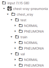 - 데이터셋은 train, test, val로 구성되며, 총 5,863개의 X-Ray 이미지와 2개의 카테고리(폐렴/정상)가 있다.