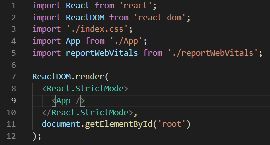 📌코드 4번째 줄 처음에 있는 App과 9번째 줄에 있는 App의 이름은 서로 동일해야 함
