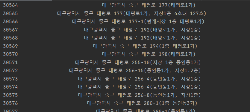 업소 주소 컬럼의 열 전체를 가져와서 address에 저장하고 출력하였다.